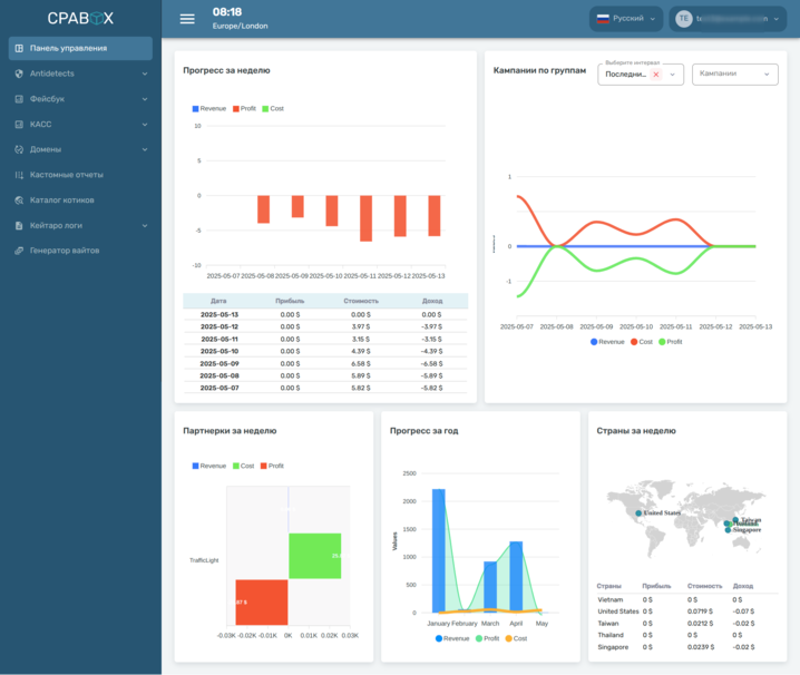 CPABOX automatically links your Keitaro campaigns with Facebook ad accounts. Configure MAPI and CAPI tokens, pixel ID once — the system will create and maintain integrations for you, saving time and reducing errors.